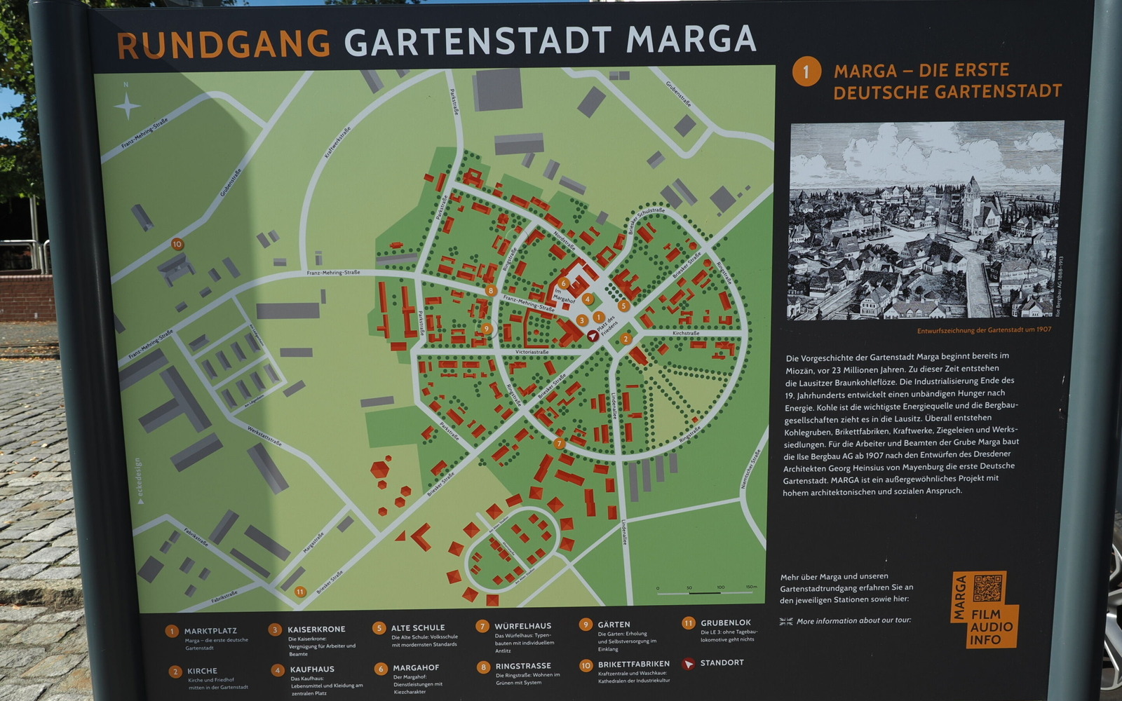 Auf den ersten Blick wirkt Marga wie eine normale Kleinstadt: gepflegt, bürgerlich, heimelig. Doch Marga ist ein Kunstwerk – vom Architekten Georg Heinsius von Mayenburg auf dem Reißbrett entworfen und innerhalb weniger Jahre von einem Bauherrn errichtet. Die Ilse Bergbau AG hat zwischen 1907 und 1915 die kühne Vision von einer lebenswerten Werkssiedlung realisiert. Ziel war es, eine zweckmäßige und zugleich menschenfreundliche Wohngegend für die Bergleute und ihre Familien zu schaffen. So entstand Deutschlands erste Gartenstadt mit grünen Alleen, Gärten mit blühenden Obstbäumen und individueller Architektur, die mit verschiedenen handwerklichen Elementen verziert ist.