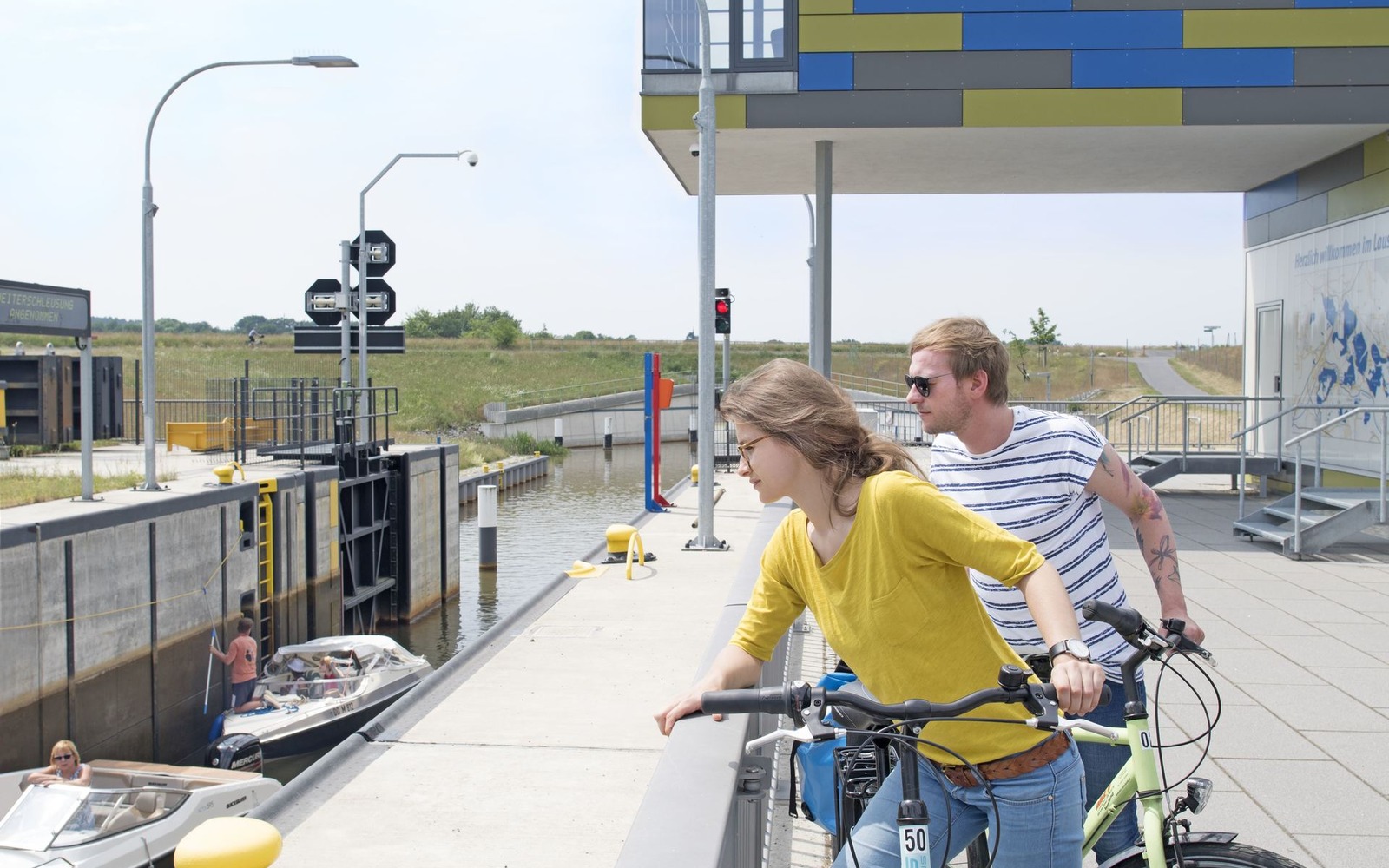 Radfahrer blicken in Schleuse im Koschener Kanal, Foto: Nada Quenzel