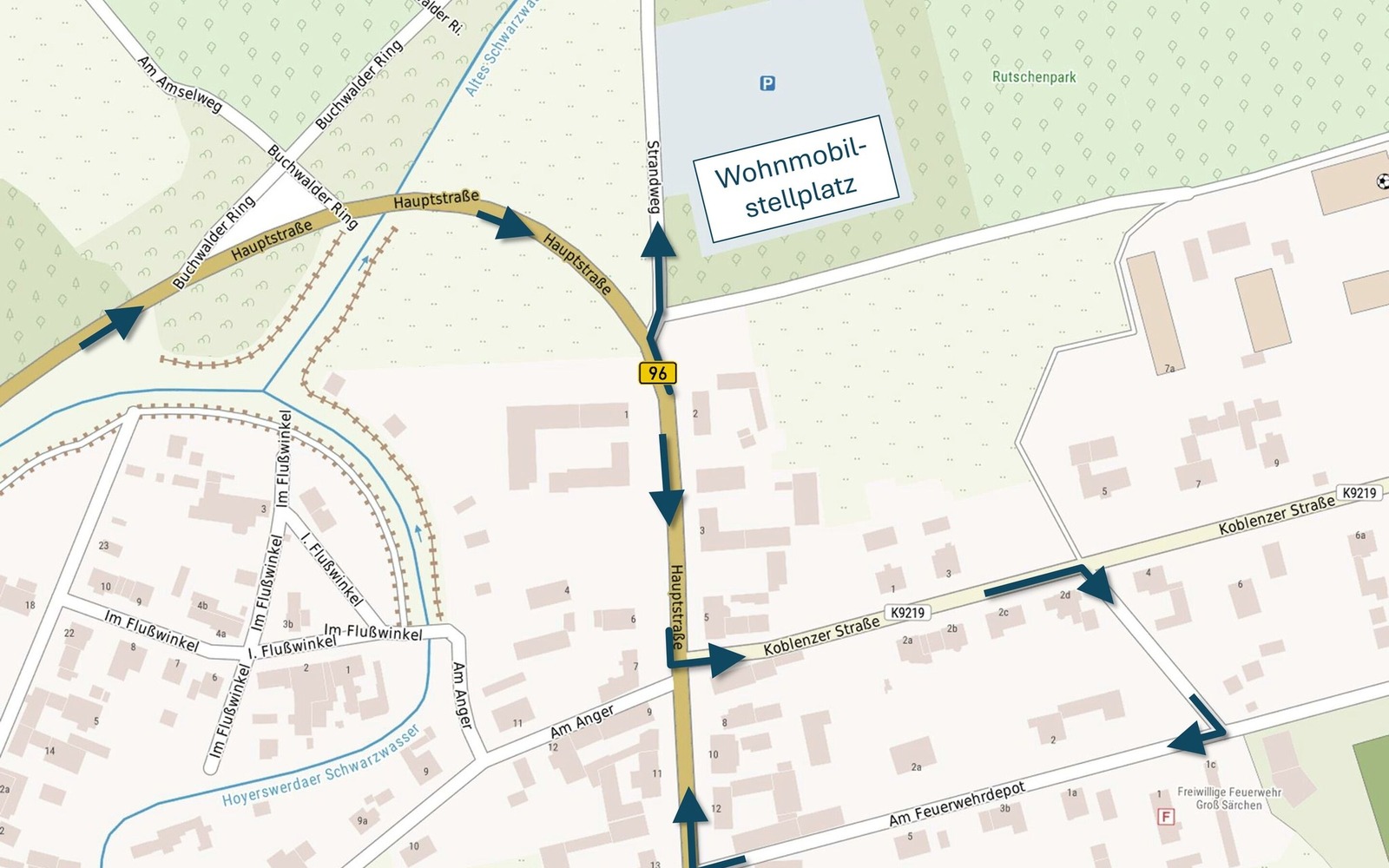 Die Anlage ist von der Bundesstraße 96 aus Richtung Westen nicht direkt erreichbar. Das Linksabbiegen in die Straße Strandweg ist nicht gestattet. Alternativ kann über die Koblenzer Straße und die Straße "Am Feuerwehrdepot" gewendet werden, um wieder auf die Hauptstraße zu gelangen.