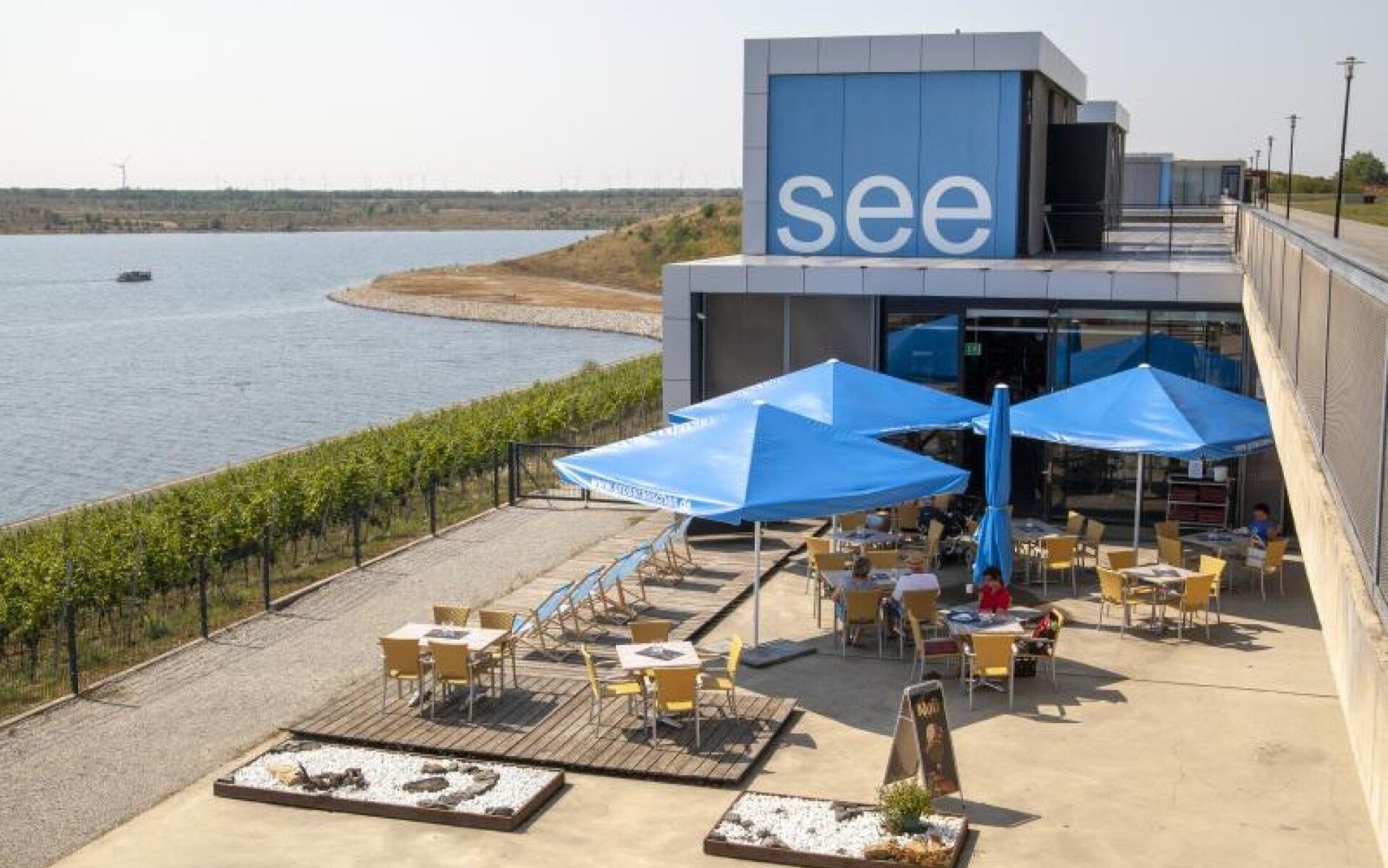 A bistro invites visitors to linger above the vineyard. From here, visitors can enjoy a beautiful view over Lake Großräschen.