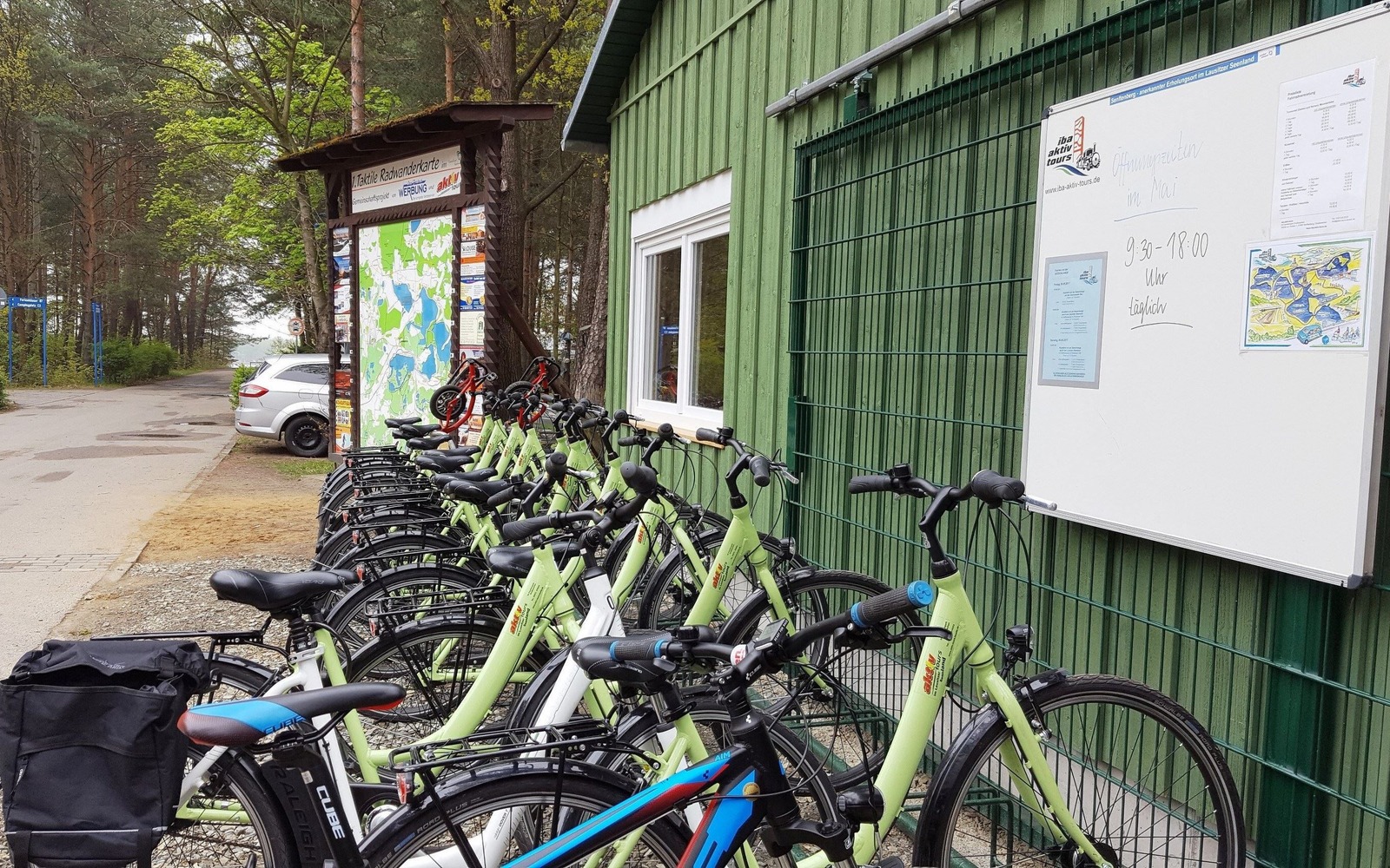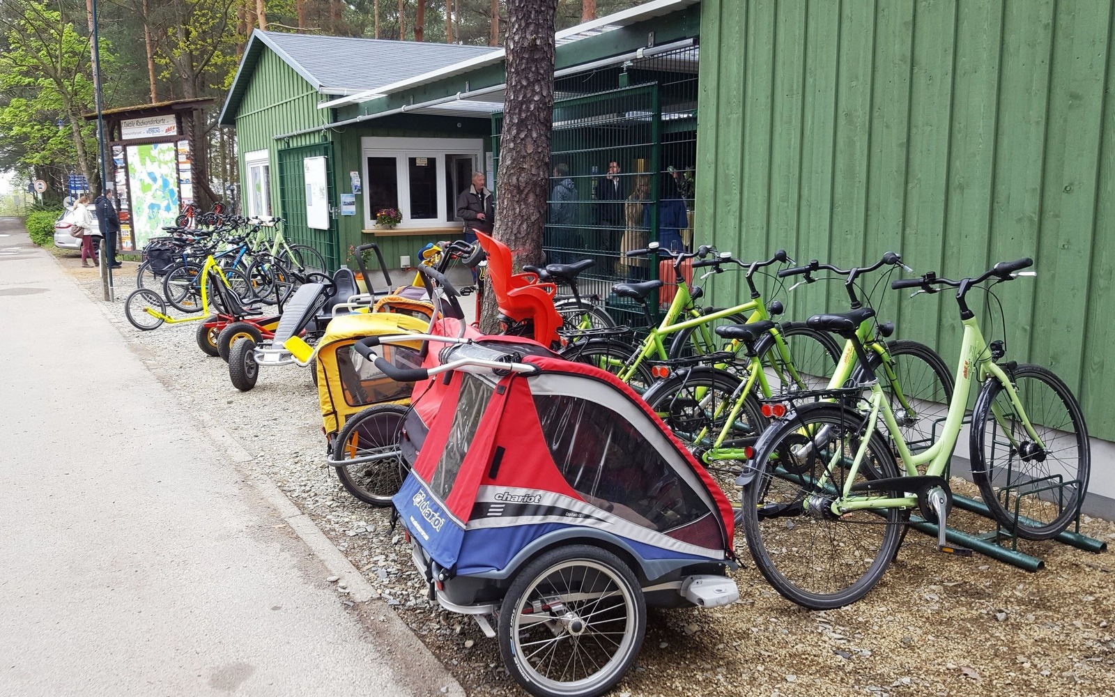 Bicycle rental station at Lake Senftenberg located in Family Park in Großkoschen. The bike centre rents bicycles for adults and childrens, child seats and trailers, e-bikes, tandem bikes and a combined bike/wheelchair plus many different pedal cars and go-karts.