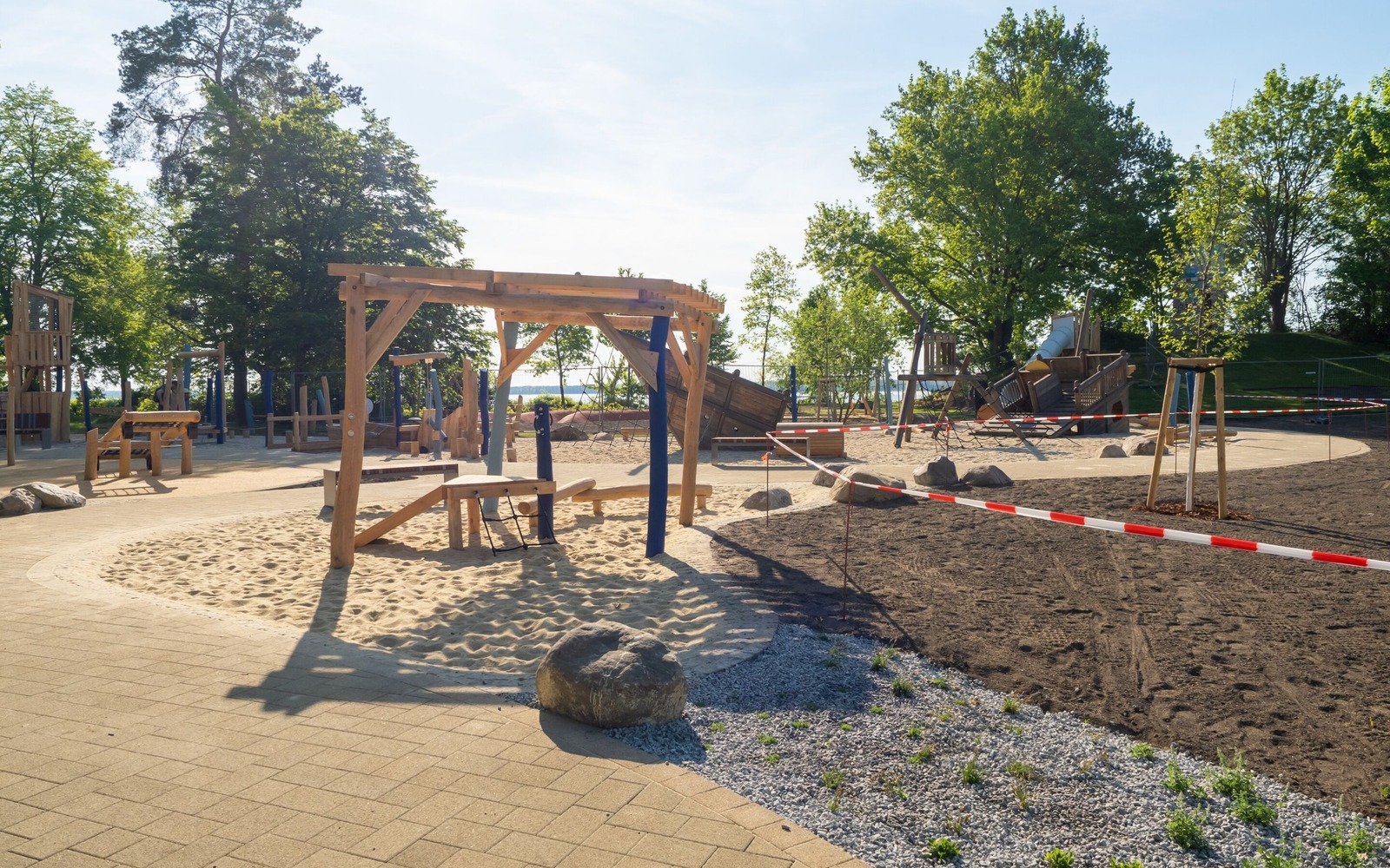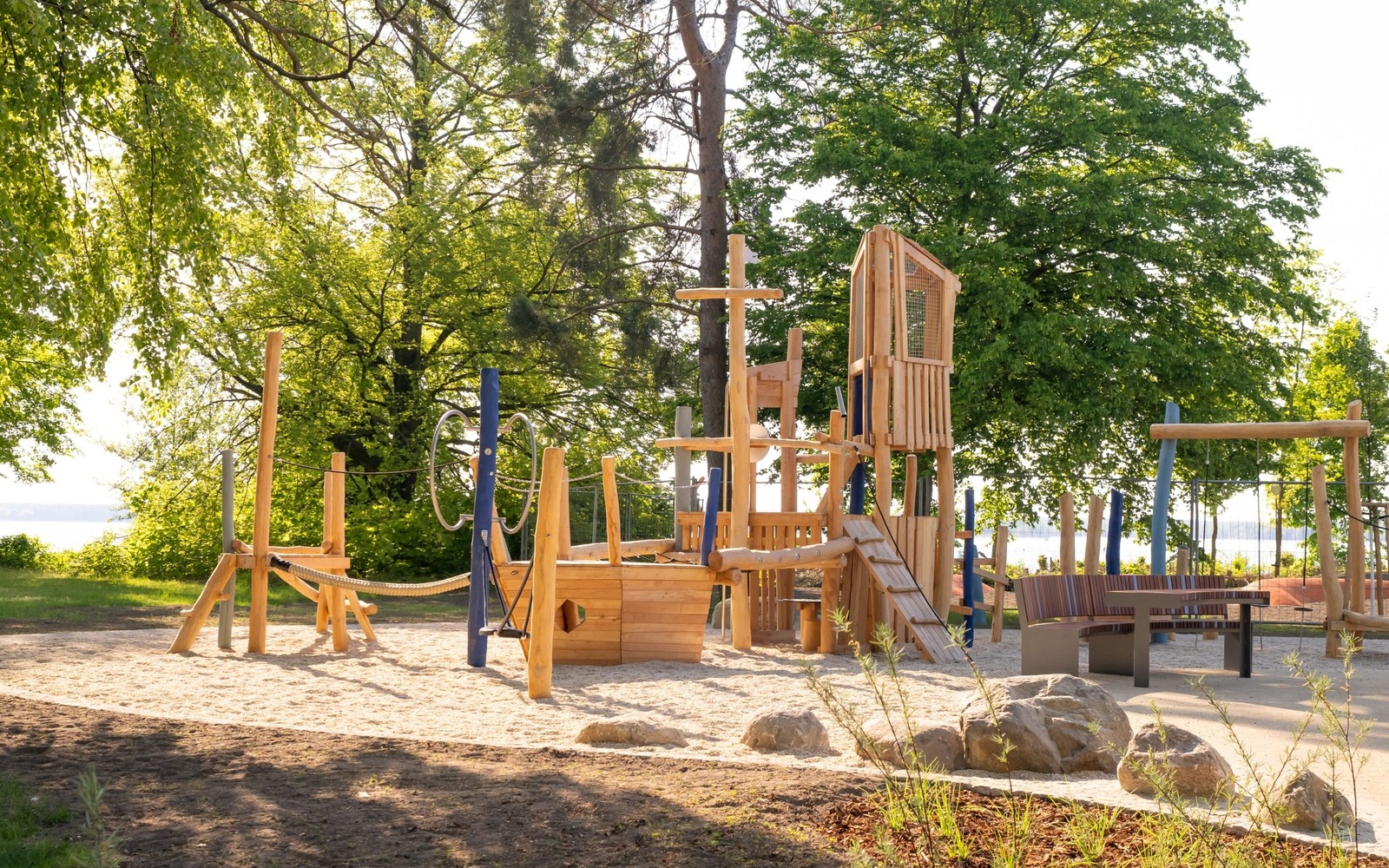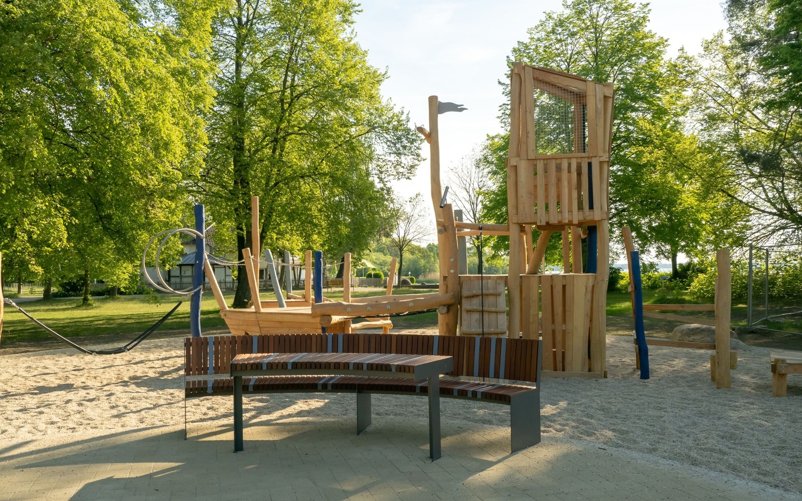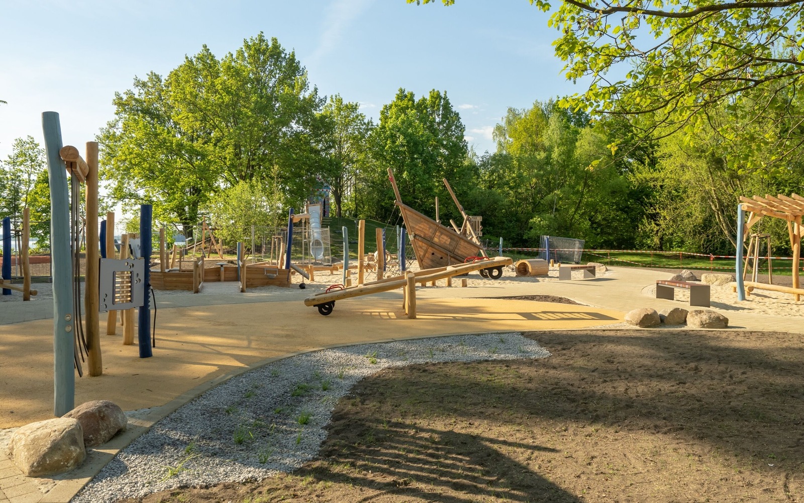 Located directly on the lakeside path near the Gaumensegel, the redesigned themed playground in Senftenberg offers a variety of play options with maritime and mining references. The focus is on the well-known play ship ‘Bounty’, which has been refurbished and integrated into the facility in a new colour scheme. An additional fleet, new climbing elements such as wooden barrels and a ropeway with a view of the lake extend the range of activities on offer. Small hills symbolise spoil tips and thematically link the former open-cast mine to today's lake district. The existing Rapunzel tower with slide will be retained, as will the neighbouring toboggan hill. The playground has an integrative area and is also easily accessible for pushchairs and wheelchairs thanks to its low-barrier paths. Several large boulders commemorate Dr Otto Rindt, one of the key designers of the Lusatian Lakeland. The nearest beach is just a few hundred metres to the east of the playground.
