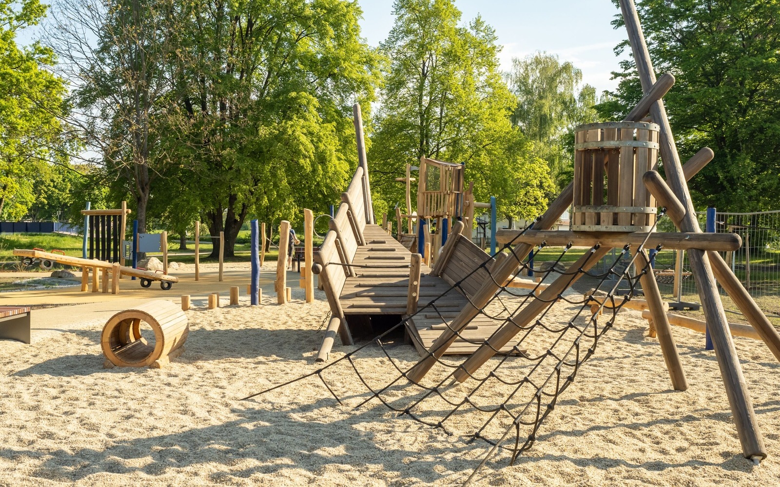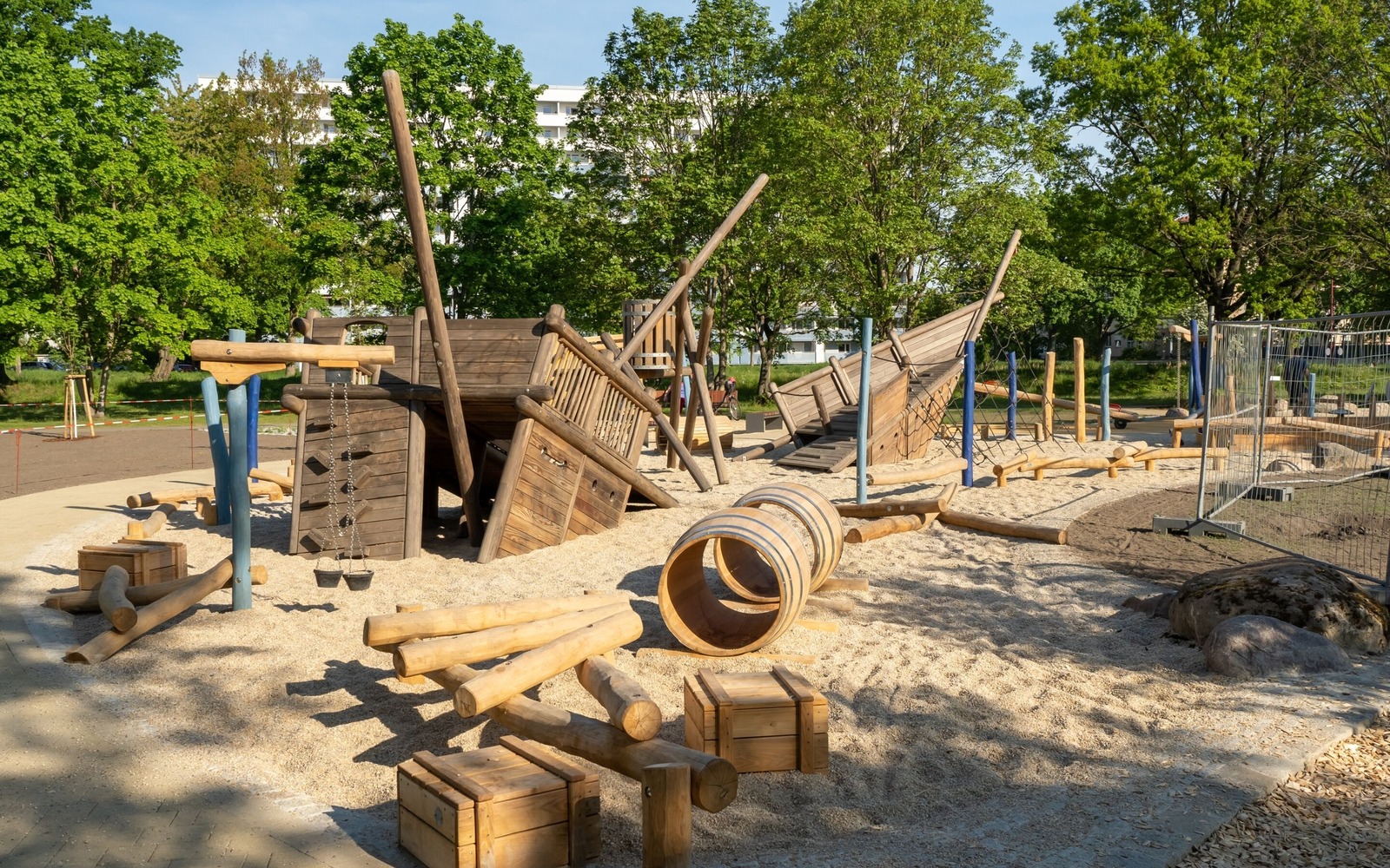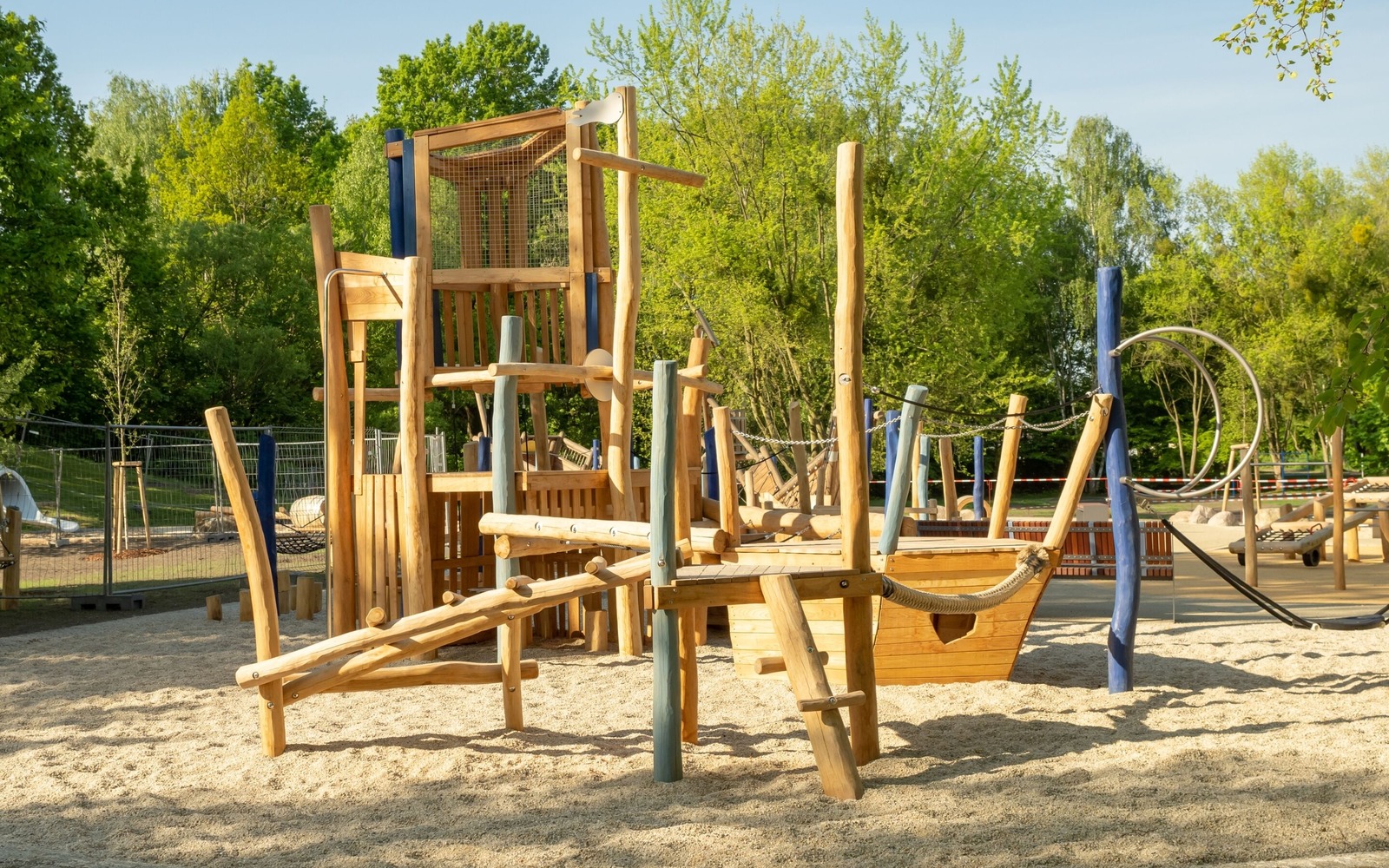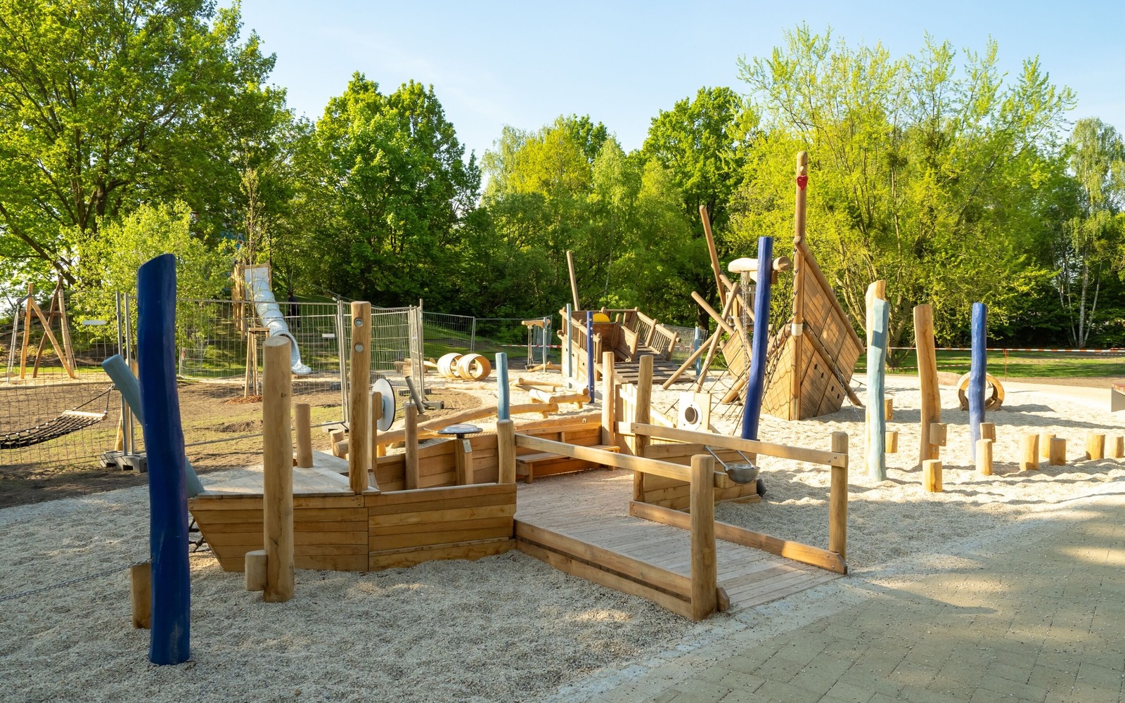 Located directly on the lakeside path near the Gaumensegel, the redesigned themed playground in Senftenberg offers a variety of play options with maritime and mining references. The focus is on the well-known play ship ‘Bounty’, which has been refurbished and integrated into the facility in a new colour scheme. An additional fleet, new climbing elements such as wooden barrels and a ropeway with a view of the lake extend the range of activities on offer. Small hills symbolise spoil tips and thematically link the former open-cast mine to today's lake district. The existing Rapunzel tower with slide will be retained, as will the neighbouring toboggan hill. The playground has an integrative area and is also easily accessible for pushchairs and wheelchairs thanks to its low-barrier paths. Several large boulders commemorate Dr Otto Rindt, one of the key designers of the Lusatian Lakeland. The nearest beach is just a few hundred metres to the east of the playground.