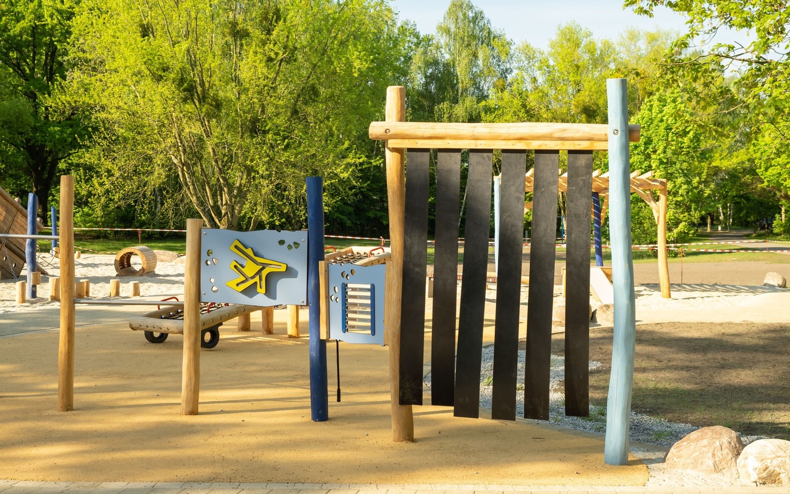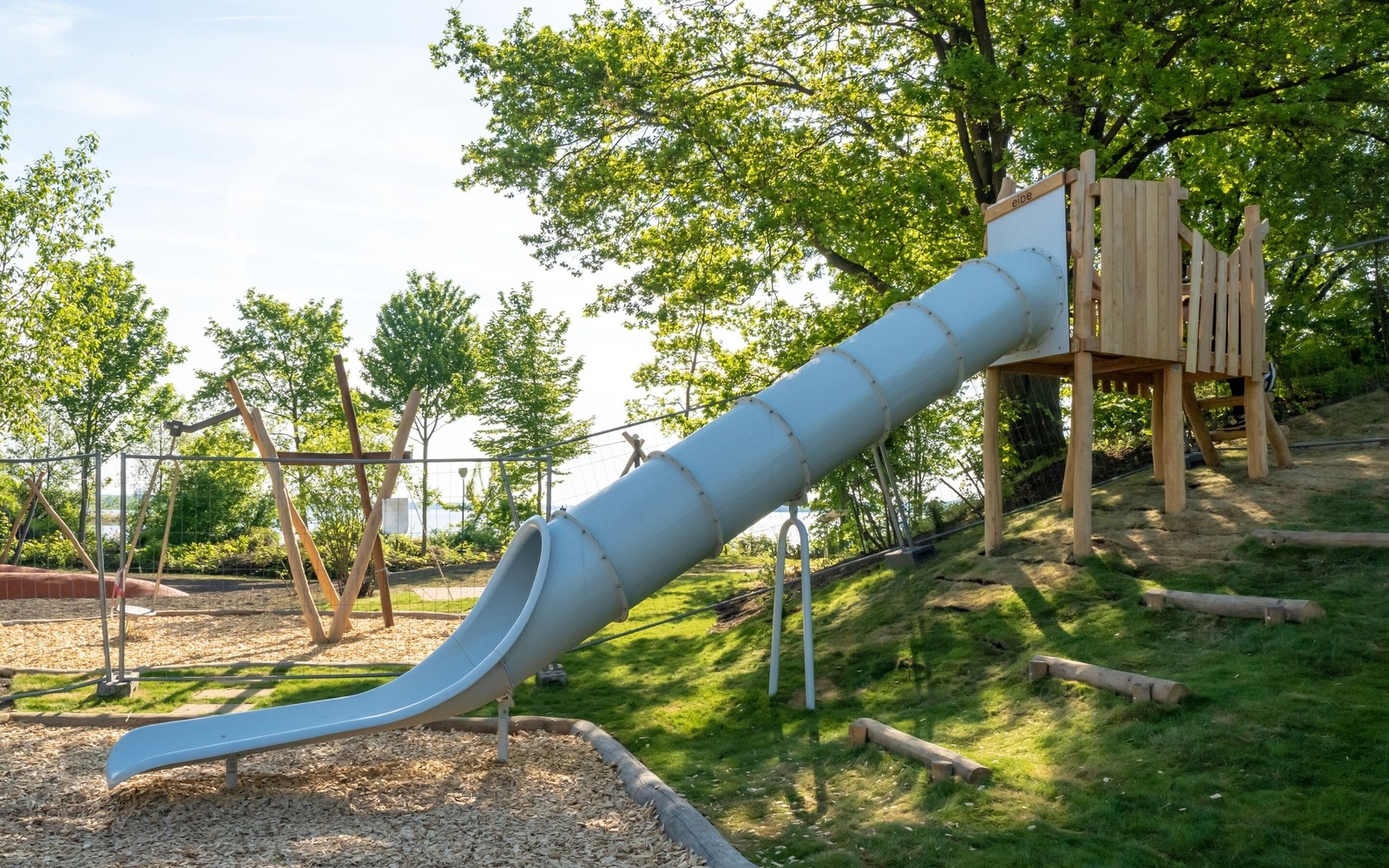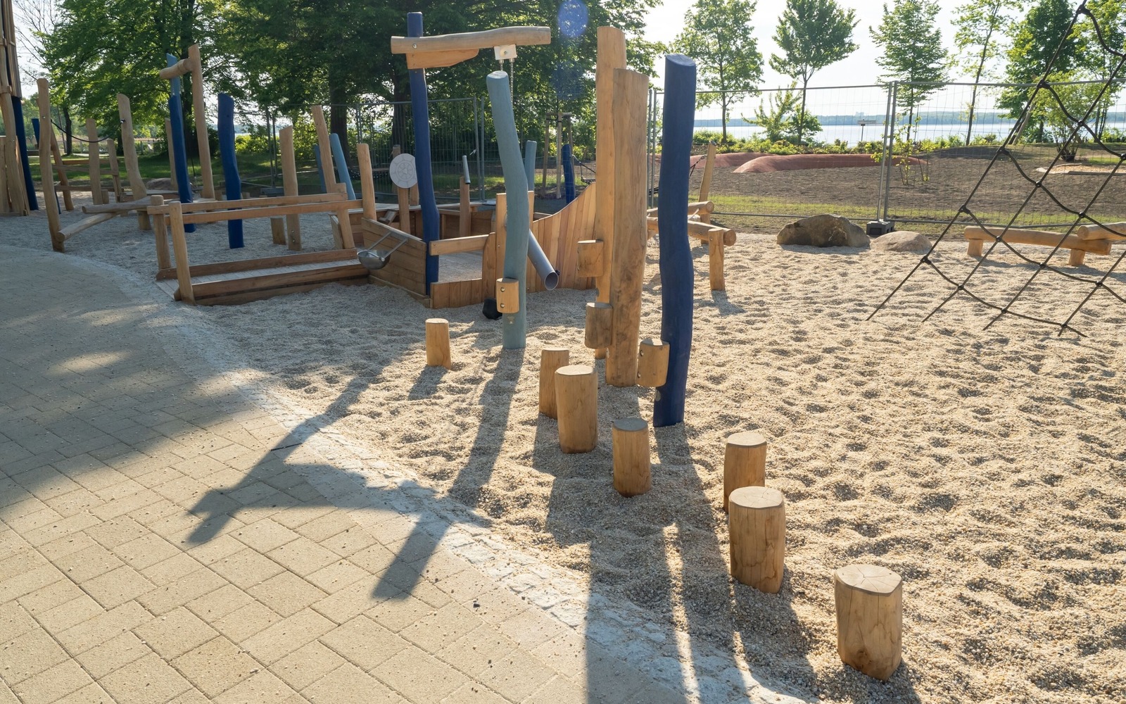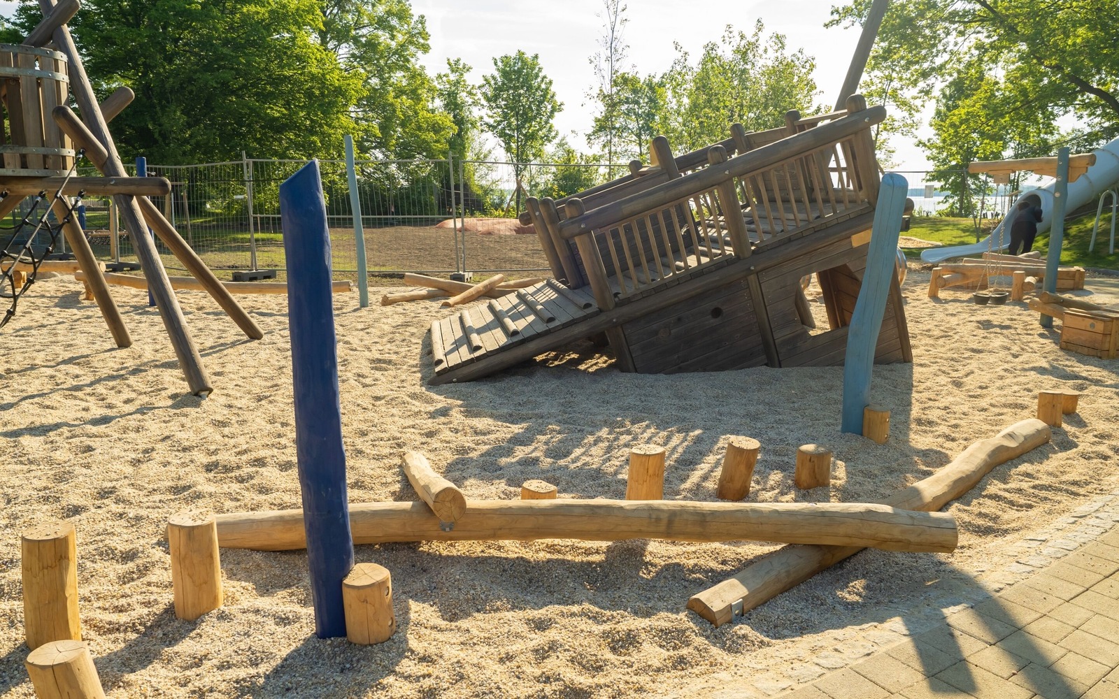 Located directly on the lakeside path near the Gaumensegel, the redesigned themed playground in Senftenberg offers a variety of play options with maritime and mining references. The focus is on the well-known play ship ‘Bounty’, which has been refurbished and integrated into the facility in a new colour scheme. An additional fleet, new climbing elements such as wooden barrels and a ropeway with a view of the lake extend the range of activities on offer. Small hills symbolise spoil tips and thematically link the former open-cast mine to today's lake district. The existing Rapunzel tower with slide will be retained, as will the neighbouring toboggan hill. The playground has an integrative area and is also easily accessible for pushchairs and wheelchairs thanks to its low-barrier paths. Several large boulders commemorate Dr Otto Rindt, one of the key designers of the Lusatian Lakeland. The nearest beach is just a few hundred metres to the east of the playground.