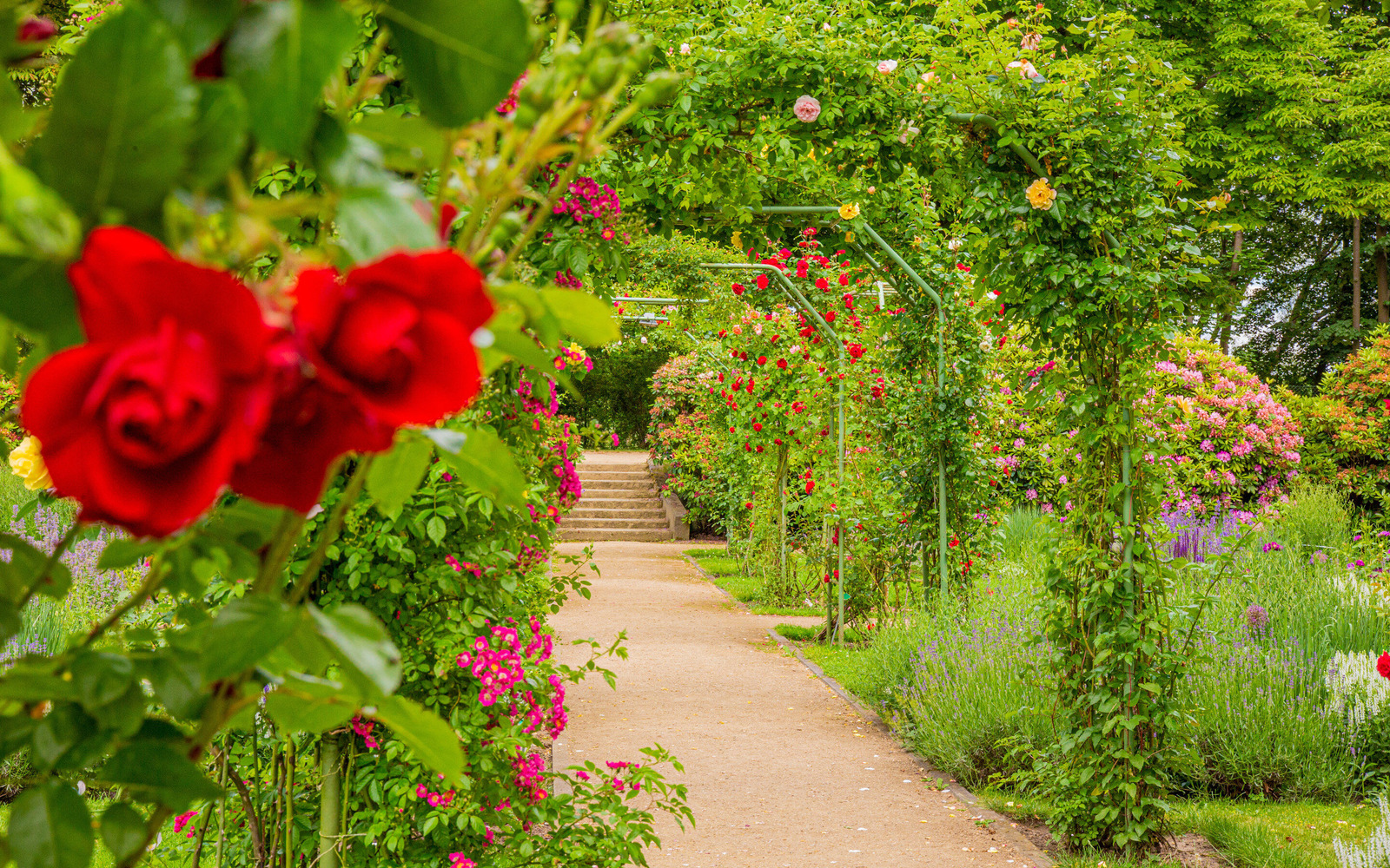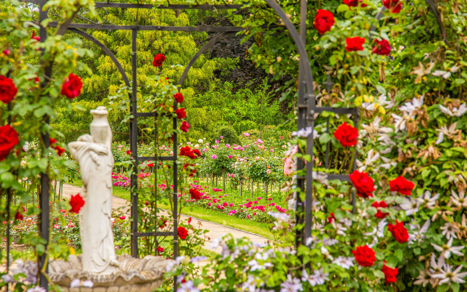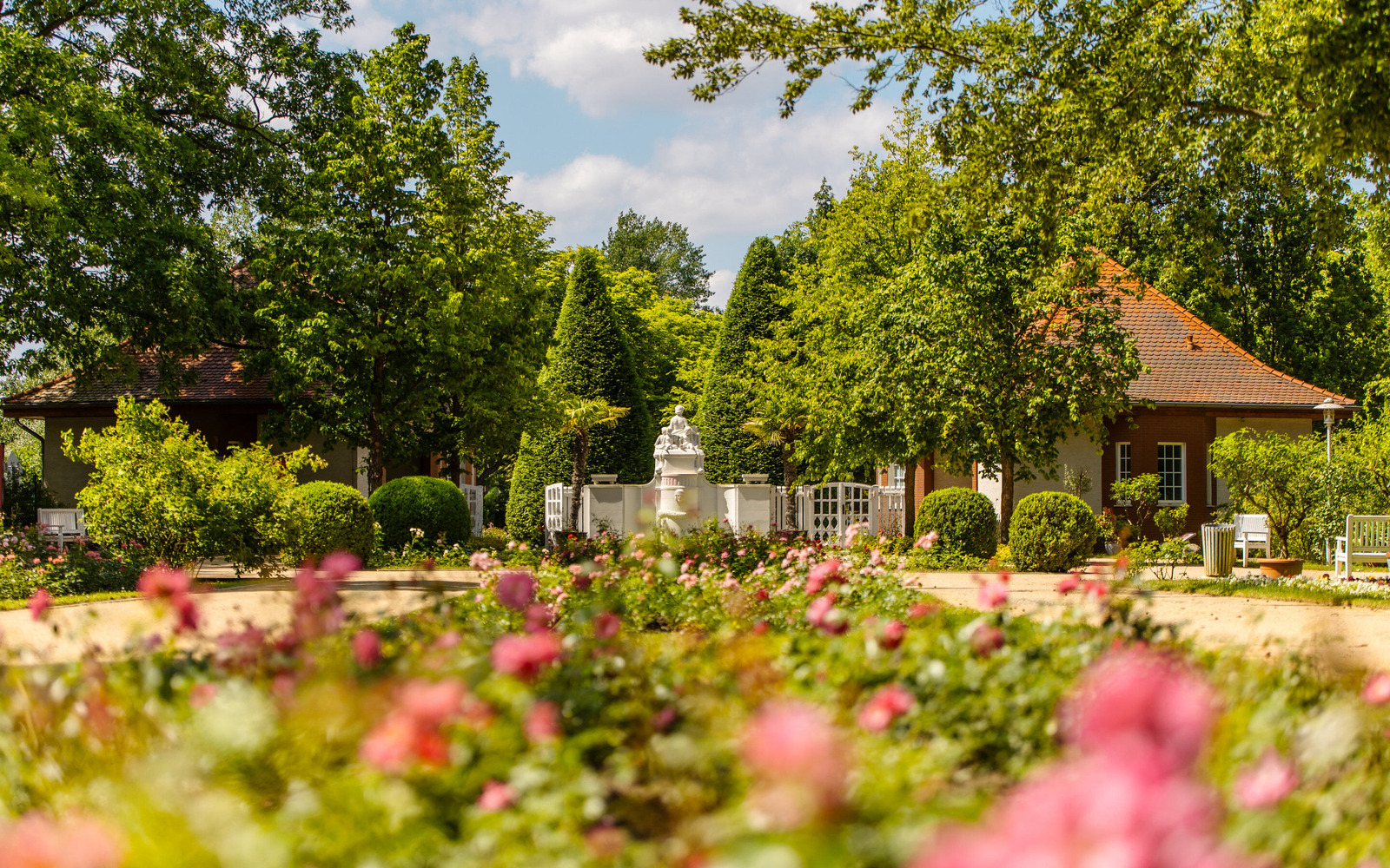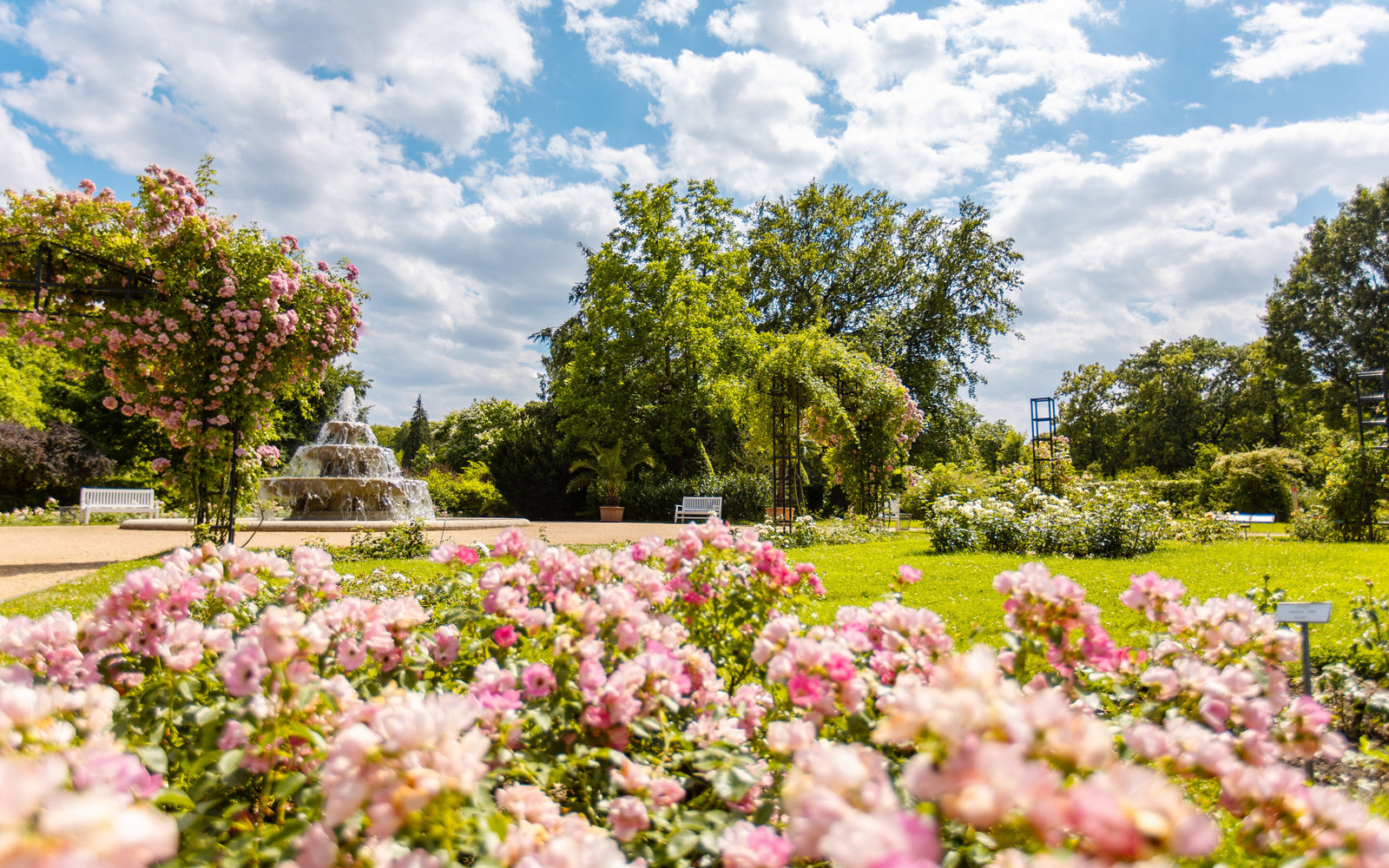 Heute finden die Besucher auf 17 ha zehntausende Rosenstöcke in fast 1.000 Sorten. Kunstvoll gefertigte Skulpturen, Pergolenhöfe, romantische Wasserspiele, Gartenbereiche im Charakter des Jugendstils und Parkelemente im englischen Landschaftsstil laden zum Verweilen ein.