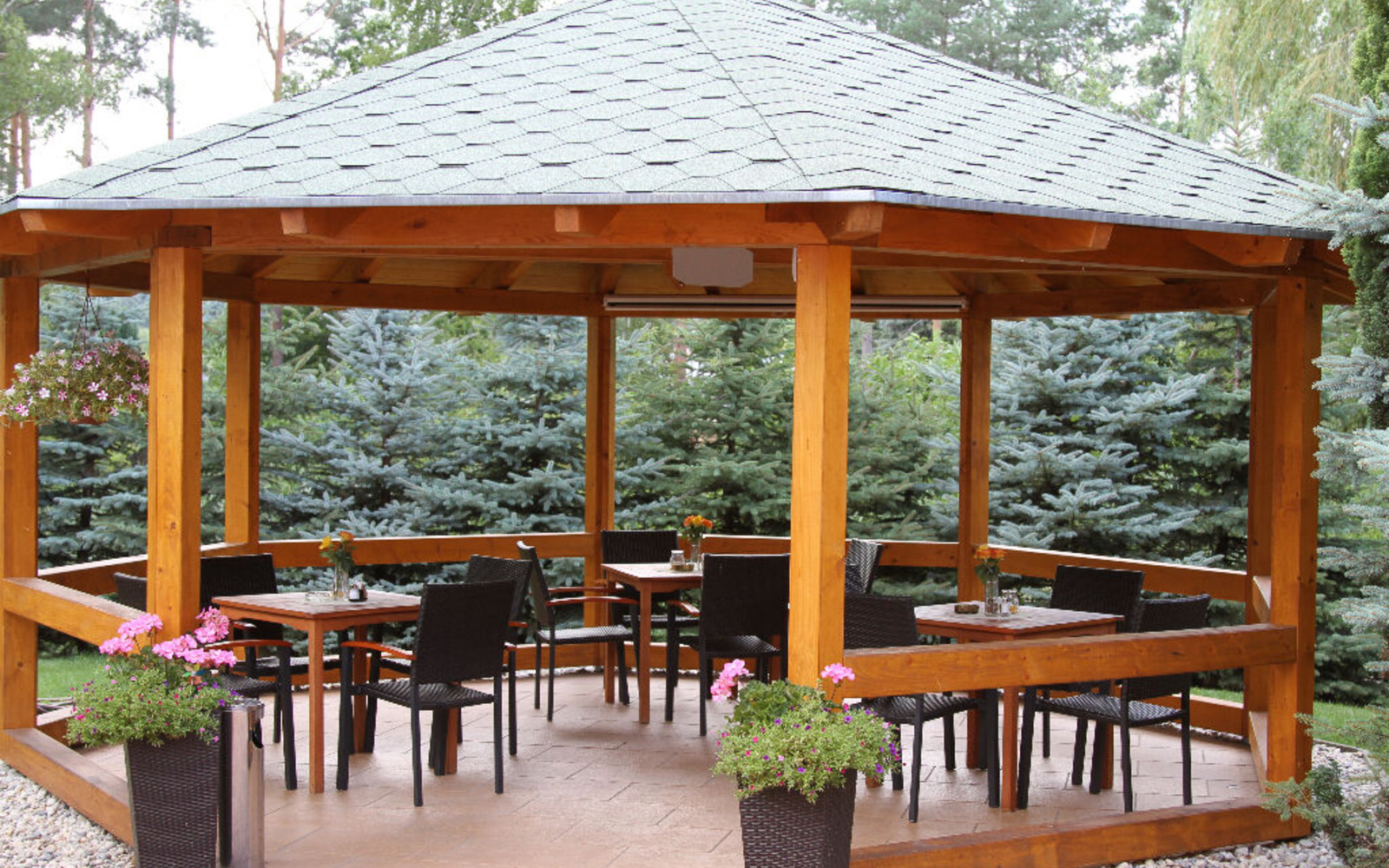 The modern dining areas can take 50 people. A room with open fire and an additional modern space can accommodate 50 and 35 people respectively. An additional 60 people can be served on the terrace with adjoining pavilion in the summer.