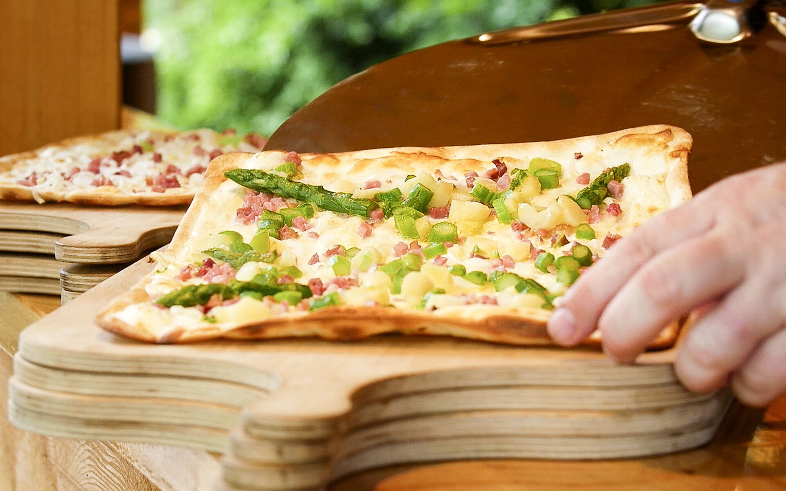In the summer (May - September), guests will dine in the stylish herb garden and will be served selected aperitifs and starters, a wide range of tartes flambées with matching wines and of course cheese platters and desserts to round off your meal.